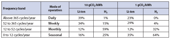 應(yīng)用于儲(chǔ)能技術(shù)充電狀態(tài)時(shí)間序列的頻率分析是應(yīng)對(duì)復(fù)雜性和量化操作行為的有用方法,因?yàn)檫@種類型的分析可用于量化不同頻率(或循環(huán)模式)在儲(chǔ)能技術(shù)中的相對(duì)重要性充電時(shí)間曲線的最佳存儲(chǔ)狀態(tài)。頻率分析的結(jié)果應(yīng)用于與圖6.13所示的儲(chǔ)能荷電狀態(tài)變量相關(guān)的模型輸出,表6.10表明,對(duì)于10gCO2/kWh的情況,儲(chǔ)氫主要表現(xiàn)在一個(gè)月內(nèi)發(fā)生的循環(huán)中(充電和放電);對(duì)于1gCO2/kWh的情況,循環(huán)頻率會(huì)降低,并且主要是季節(jié)性的(64%)。與其相反,鋰離子電池儲(chǔ)能系統(tǒng)顯示出每天和每周充放電循環(huán)的趨勢(shì)。在10gCO2/kWh的情況下,每日和每周充放電循環(huán)占運(yùn)行模式的73%;在1gCO2/kWh的情況下,它們僅占運(yùn)行模式的52%。值得強(qiáng)調(diào)的是,鋰離子電池儲(chǔ)能系統(tǒng)在1gCO2/kWh的情況下也顯示出很大比例的季節(jié)性循環(huán)(35%),這反映了這一技術(shù)在一年中的某些時(shí)期的使用頻率低于其他時(shí)期的事實(shí)。