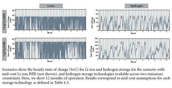 研究團(tuán)隊(duì)的模型突出了各類儲(chǔ)能技術(shù)的不同運(yùn)行模式,這些模式受單個(gè)技術(shù)的屬性和系統(tǒng)條件(例如碳排放限制的嚴(yán)格性)的影響。圖6.13顯示了在研究團(tuán)隊(duì)的深度脫碳的德克薩斯系統(tǒng)模型中,儲(chǔ)能系統(tǒng)的循環(huán)頻率(深度放電和充電循環(huán)),其中鋰離子電池和氫氣作為可用的儲(chǔ)能技術(shù)。正如預(yù)期的那樣,鋰離子電池儲(chǔ)能系統(tǒng)以其相對(duì)較低的裝機(jī)容量成本、相對(duì)較高的儲(chǔ)能容量成本和較高的往返效率(RTE)主要用于短期儲(chǔ)能應(yīng)用中,而氫氣儲(chǔ)能則具有較高的電力成本但較低的儲(chǔ)能容量成本和往返效率(RTE),與鋰離子電池儲(chǔ)能系統(tǒng)相比,主要用于更長(zhǎng)時(shí)間的儲(chǔ)能應(yīng)用場(chǎng)景。然而,這些運(yùn)行模式并不是每種儲(chǔ)能系統(tǒng)技術(shù)獨(dú)有的,研究團(tuán)隊(duì)看到鋰離子電池儲(chǔ)能有時(shí)會(huì)執(zhí)行相對(duì)較長(zhǎng)的充電/放電循環(huán),而氫氣儲(chǔ)能有時(shí)會(huì)快速循環(huán)。此外,儲(chǔ)能技術(shù)的最佳運(yùn)行模式也受到碳排放限制的影響:更嚴(yán)格的碳排放限制會(huì)導(dǎo)致更長(zhǎng)的充放電周期,如圖6.13的頂部和底部的比較所示。