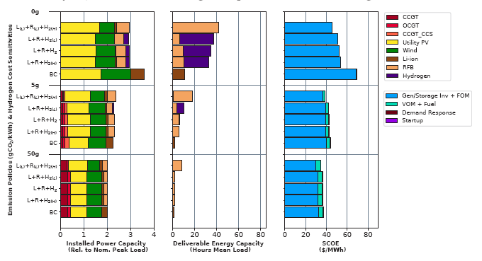 圖6.12 德克薩斯州地區(qū)一系列碳排放限制條件下低、中、高成本氫氣對(duì)裝機(jī)容量、儲(chǔ)能容量和系統(tǒng)平均電力成本(SCOE)的影響