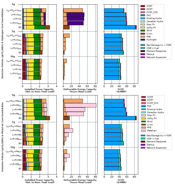 圖6.11 在美國(guó)東北地區(qū)一系列碳排放限制條件下,低、中、高成本氫氣(頂行)和金屬空氣電池(底行)儲(chǔ)能系統(tǒng)對(duì)裝機(jī)容量、儲(chǔ)能容量和系統(tǒng)平均電力成本(SCOE的影響