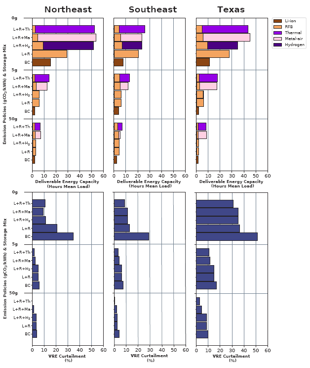 研究團(tuán)隊(duì)的分析還表明,在模擬區(qū)域中安裝的儲(chǔ)能系統(tǒng)的儲(chǔ)能容量和可再生能源發(fā)電削減之間存在明顯的權(quán)衡。當(dāng)在5gCO2/kWh的情況下使用長(zhǎng)時(shí)儲(chǔ)能系統(tǒng)是最佳選擇的時(shí)候,其持續(xù)時(shí)間通常比與鋰離子電池儲(chǔ)能系統(tǒng)或液流電池儲(chǔ)能系統(tǒng)長(zhǎng)得多(圖6.10)。在分析的情景中,長(zhǎng)時(shí)儲(chǔ)能系統(tǒng)的持續(xù)時(shí)間在39到59小時(shí)之間,而鋰離子電池儲(chǔ)能系統(tǒng)的持續(xù)時(shí)間為1~2小時(shí),液流電池儲(chǔ)能系統(tǒng)的持續(xù)時(shí)間為6~11小時(shí)。這些持續(xù)時(shí)間轉(zhuǎn)化為可交付的總持續(xù)時(shí)間6~18小時(shí)(跨長(zhǎng)時(shí)儲(chǔ)能選項(xiàng)和建模的區(qū)域)的儲(chǔ)能容量。在5gCO2/kWh的情況下,東北部和東南部的最佳可再生能源棄電從沒有部署長(zhǎng)時(shí)儲(chǔ)能系統(tǒng)的5%~6%降低到部署長(zhǎng)時(shí)儲(chǔ)能的2%~6%)。德克薩斯州的最佳可再生能源削減量從沒有采用長(zhǎng)時(shí)儲(chǔ)能系統(tǒng)的19%減少到采用長(zhǎng)時(shí)儲(chǔ)能系統(tǒng)的13%~17%,碳排放強(qiáng)度限制為5gCO2/kWh。德克薩斯州相對(duì)較高的可再生能源削減量,即使采用長(zhǎng)時(shí)儲(chǔ)能系統(tǒng),也反映了該地區(qū)較高的可再生能源資源質(zhì)量,這降低了過度部署可再生能源的成本損失,從而降低了儲(chǔ)能系統(tǒng)的邊際價(jià)值。