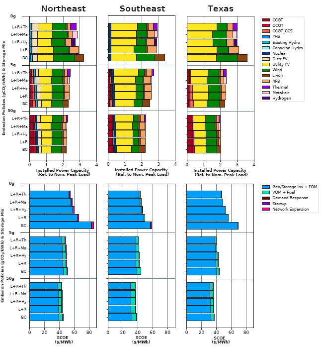 圖6.9 在美國(guó)東北部、東南部和德克薩斯州的一系列碳排放限制條件下,增加液流電池+長(zhǎng)時(shí)儲(chǔ)能技術(shù)對(duì)裝機(jī)容量和系統(tǒng)平均電力成本(SCOE)的影響