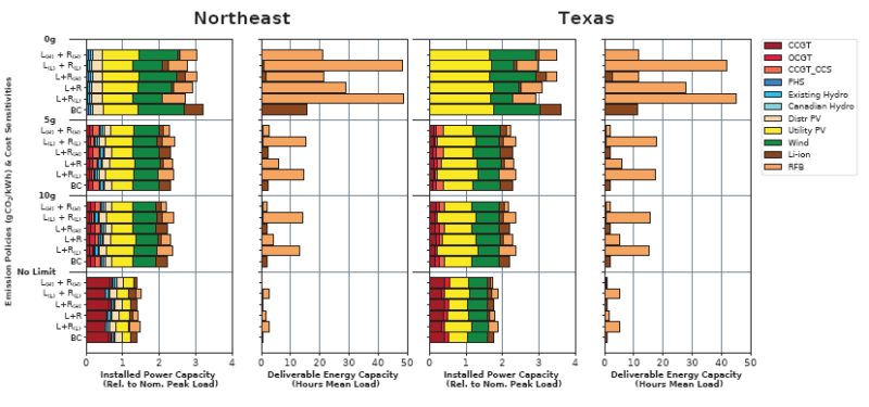 探索對(duì)鋰離子電池儲(chǔ)能系統(tǒng)和液流電池儲(chǔ)能系統(tǒng)的低、中、高成本合理假設(shè)的敏感性,并總結(jié)以下幾點(diǎn):(1)在研究團(tuán)隊(duì)使用液流電池技術(shù)分析的所有場(chǎng)景中,液流電池儲(chǔ)能系統(tǒng)的持續(xù)時(shí)間為7~27小時(shí),而鋰離子電池儲(chǔ)能系統(tǒng)的持續(xù)時(shí)間為1~5小時(shí)。(2)在可用的情況下,兩種技術(shù)都部署在所有場(chǎng)景中,這表明從電力系統(tǒng)的角度來看,這兩種技術(shù)都不是主導(dǎo)的。(3)液流電池的可用性使得更多的可再生能源能夠替代天然氣發(fā)電設(shè)施,這反映了長(zhǎng)時(shí)儲(chǔ)能的價(jià)值和儲(chǔ)能容量成本更低。例如,中等成本和低成本的液流電池(以及中等成本的鋰離子電池)將德克薩斯州的天然氣發(fā)電量減少9GW~27GW,并將可再生能源發(fā)電量相對(duì)于基本情況增加10GW~23GW。(4)與基本情況相比,添加液流電池儲(chǔ)能系統(tǒng)降低了電力系統(tǒng)成本,在5gCO2/kWh的情況下觀察到的成本降低幅度最大,其中包括兩種電池技術(shù)的低成本假設(shè)(東北部為12%,德克薩斯州為14%,東南部為16%)。