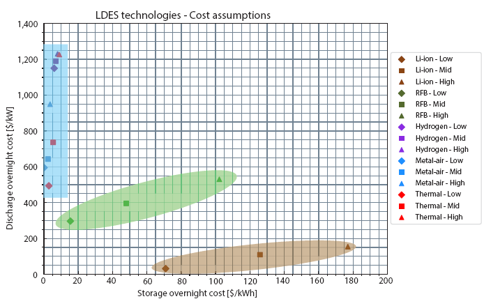 研究團(tuán)隊(duì)的分析考慮了四種不同的長(zhǎng)時(shí)儲(chǔ)能(LDES)技術(shù),正如這份研究報(bào)告前面以技術(shù)為重點(diǎn)的章節(jié)中所定義的那樣:氧化還原液流電池(RFB)、金屬空氣電池、氫氣儲(chǔ)能和熱儲(chǔ)能。這些技術(shù)處于不同的成熟度;因此,研究團(tuán)隊(duì)的實(shí)驗(yàn)設(shè)計(jì)旨在了解不同類別儲(chǔ)能技術(shù)的相對(duì)優(yōu)點(diǎn),而不是確定最有利的每個(gè)類別中的技術(shù)。圖6.7突出顯示了基于三個(gè)關(guān)鍵設(shè)計(jì)屬性中的兩個(gè)的儲(chǔ)能技術(shù)分類:1類技術(shù)具有最低的裝機(jī)容量成本、相對(duì)較高的儲(chǔ)能容量成本和高往返效率(例如鋰離子電池);2類技術(shù)具有中等功率和儲(chǔ)能容量成本以及往返效率(例如氧化還原液流電池);第3類技術(shù)具有高裝機(jī)容量成本、低儲(chǔ)能容量成本和低往返效率(例如金屬空氣電池、氫氣和熱儲(chǔ)能等新興的長(zhǎng)時(shí)儲(chǔ)能技術(shù))。