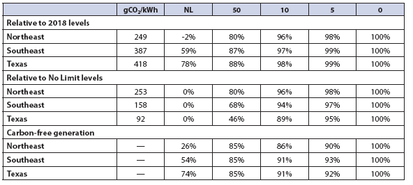 研究發(fā)現(xiàn),在電力部門沒有任何碳排放限制的情況下,這里研究的三個(gè)美國(guó)地區(qū)(德克薩斯州、東北部和東南部)在相同的2050年技術(shù)成本假設(shè)下實(shí)現(xiàn)了截然不同的碳排放強(qiáng)度。這些差異主要是由于可再生資源質(zhì)量和負(fù)荷分布的區(qū)域差異造成的。