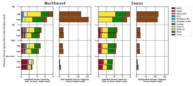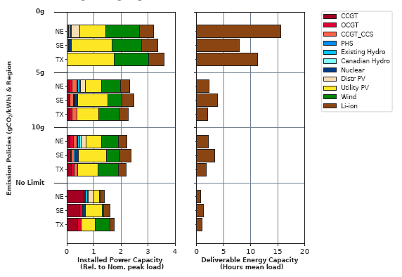 隨著美國(guó)這三個(gè)地區(qū)的碳排放限制政策的加強(qiáng),天然氣發(fā)電能力逐漸被部署的規(guī)模更大的可變可再生能源發(fā)電設(shè)施和鋰離子電池儲(chǔ)能系統(tǒng)以及天然氣發(fā)電設(shè)施所取代。值得注意的是,CCGT發(fā)電設(shè)施的容量系數(shù)從德克薩斯州的36%、美國(guó)東南部的54%和東北部的66%在無限制情況下下降到5gCO2/kWh,達(dá)到這三個(gè)地區(qū)的2%~5%。相對(duì)于在無碳排放限制政策情景中建模的已經(jīng)非常顯著的可再生能源裝機(jī)容量增加,在5gCO2/kWh的情況下,可再生能源的裝機(jī)容量增加:48%(德克薩斯州)、139%(東南部)和257%(東北部),并且增加了在0gCO2/kWh的情況下,185%(德克薩斯州)、281%(東南部)和500%(東北部)。