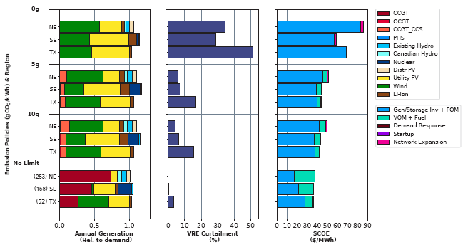 相對(duì)于沒有碳排放限制(“無限制”)政策案例,將碳排放限制收緊至5gCO2/kWh會(huì)帶來更高的成本。在基本情況下,實(shí)現(xiàn)平均電網(wǎng)碳強(qiáng)度5gCO2/kWh(相對(duì)于無限制情況下的SCOE)的系統(tǒng)平均電力成本(SCOE)增加百分比取決于資源可用性和負(fù)載變化,并且在三個(gè)地區(qū)有所不同,德克薩斯州占21%,東南部占23%,東北部占36%。這轉(zhuǎn)化為相對(duì)于“無限制”政策案例每噸碳排放量88美元到644美元的邊際減排成本(表6.7)。這些高邊際成本表明降低負(fù)排放技術(shù)或長(zhǎng)時(shí)儲(chǔ)能成本的價(jià)值。在沒有其他政策的情況下,它們也是有效地衡量碳價(jià)格的措施,為實(shí)現(xiàn)這些脫碳水平提供足夠的激勵(lì)。在所有地區(qū),隨著化石燃料發(fā)電設(shè)施的作用下降,運(yùn)營(yíng)成本的降低部分抵消了可再生能源和儲(chǔ)能系統(tǒng)等資本密集型資源的投資成本增加。