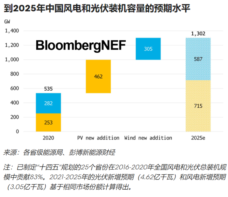 中國31個省、直轄市和自治區(qū)中,包括山西省在內(nèi)已有25個省份制定出詳細的2025年可再生能源發(fā)電裝機目標,其中風電和光伏新增裝機超過7.5億千瓦。新增裝機規(guī)模將比中國2020年的風電和光伏總裝機高出50%。該“十四五”規(guī)劃的新主題體現(xiàn)為廣泛新增和高效消納。
