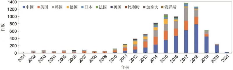第二階段2009—2018年,屬于技術(shù)的高速增長期。專利數(shù)量急劇增長,在2017年達到峰值。在這一階段,中國專利數(shù)量增長迅速,成為推動鋰硫電池技術(shù)發(fā)展的重要國家和關(guān)鍵驅(qū)動力。