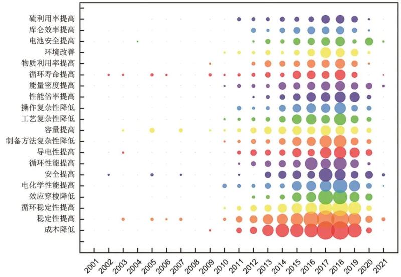 圖4 鋰硫電池領(lǐng)域技術(shù)功效的趨勢分布