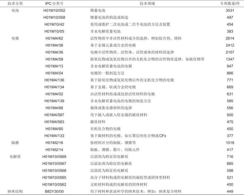 當前IPC專利分類法為國際公認的專利分類方法,該方法遵循功能與應(yīng)用相結(jié)合的主要原則,對專利技術(shù)內(nèi)容進行了逐級劃分,形成了較為系統(tǒng)全面的等級分類體系。根據(jù)IPC專利分類法,鋰硫電池相關(guān)專利主要涉及了電池、電極、隔膜、電解質(zhì)、納米結(jié)構(gòu)五大類,具體如表1所示。其中鋰蓄電池相關(guān)專利最多,達到3531件,其次是活性物質(zhì)中非活性材料成分的選擇,達到2614件。近年來的鋰蓄電池,活性物質(zhì)中非活性材料成分的選擇,基于金屬元素或合金的電極,電極中活性物質(zhì)、活性體、活性液體的材料的選擇,除氧化物或氫氧化物以外的無機化合物的活性物質(zhì)選擇,按材料區(qū)分的隔板、薄膜等,以溶劑為特征的電解質(zhì),用于材料和表面科學的納米技術(shù)等成為主要技術(shù)研究熱點。