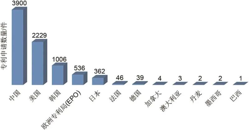 鋰硫電池專利申請主要分布在中國、美國和韓國三個國家,如圖2所示。其中,中國的專利申請量為3900件,位居全球第一位,占專利申請總量的48.60%;其次是美國專利申請數(shù)量為2229件,占專利申請總量的27.78%;韓國的專利申請量為1006件,日本的專利申請量為362件,歐洲專利局、日本、法國等其他國家或地區(qū)的專利申請量則相對較少。