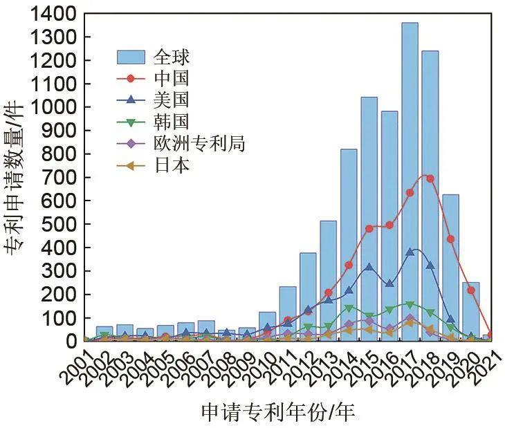 圖1 全球主要國家或地區(qū)的鋰硫電池技術(shù)專利申請量變化趨勢