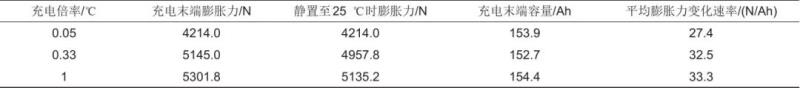 表3 動(dòng)力電池在25 ℃、0.05 C、0.33 C、1 C倍率充電時(shí)膨脹力數(shù)據(jù)表
