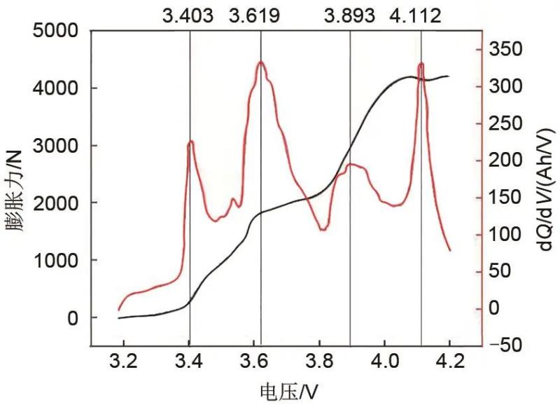 對(duì)動(dòng)力電池充電過程中的dQ/dV曲線進(jìn)行分析發(fā)現(xiàn)其四個(gè)波峰分別對(duì)應(yīng)膨脹力增加的四個(gè)階段,dQ/dV曲線的波峰反映了正負(fù)極材料的相變,不同的相變使得正負(fù)極材料厚度發(fā)生不同的變化。前期膨脹力的快速變化主要是由于石墨負(fù)極在不同充電深度時(shí)的相變,而在末期的緩慢波動(dòng)則與正極材料的收縮和石墨負(fù)極排列狀態(tài)的變化密切相關(guān)。