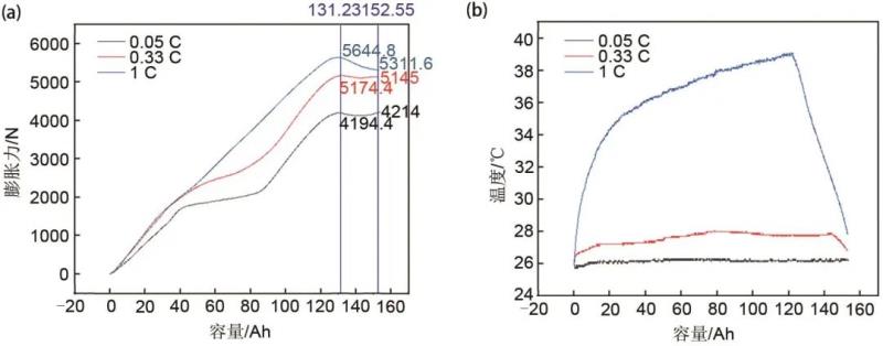 圖3 動(dòng)力電池在25 ℃、0.05 C、0.33 C、1 C倍率充電時(shí)(a) 充電容量和膨脹力曲線;(b) 溫度變化曲線