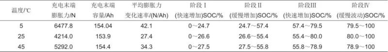 表2 動(dòng)力電池在0.05 C、不同溫度下膨脹力及其變化階段對(duì)應(yīng)的SOC數(shù)據(jù)表