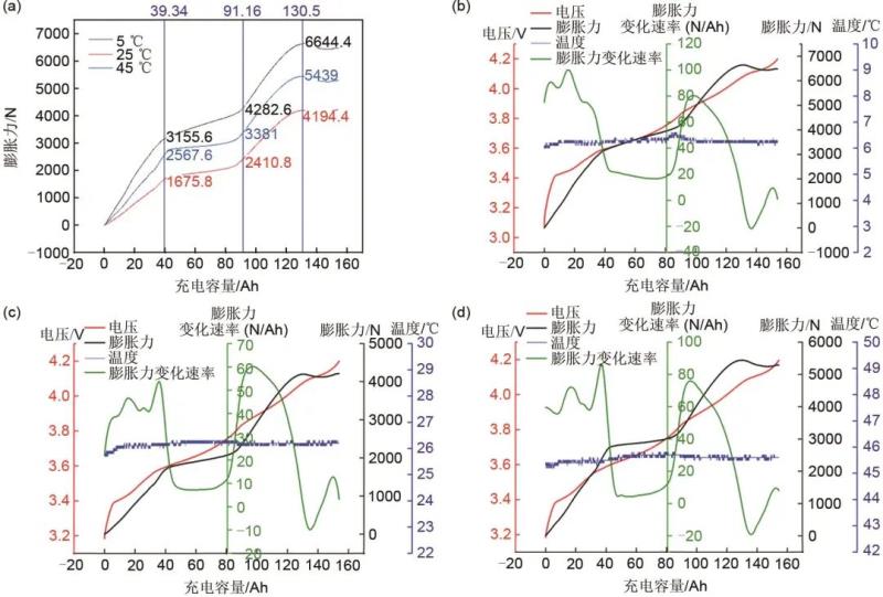 圖2 動(dòng)力電池膨脹力變化特性:(a) 動(dòng)力電池在0.05 C、不同溫度下充電容量和膨脹力曲線;(b) 動(dòng)力電池在5 ℃、0.05 C下電壓、溫度、膨脹力、膨脹力變化速率隨充電容量的變化圖;(c) 動(dòng)力電池在25 ℃、0.05 C下電壓、溫度、膨脹力、膨脹力變化速率隨充電容量的變化圖;(d) 動(dòng)力電池在45 ℃、0.05 C下電壓、溫度、膨脹力、膨脹力變化速率隨充電容量的變化圖