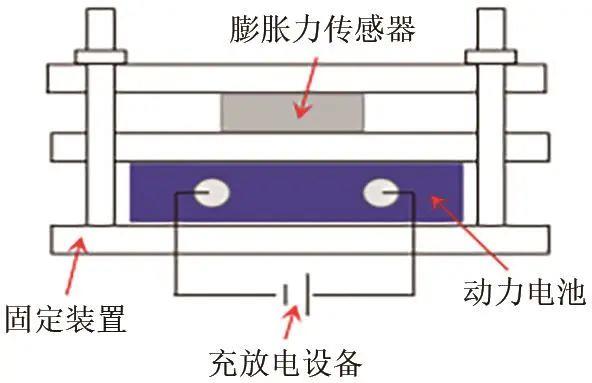 圖1為動(dòng)力電池膨脹力測(cè)試裝置,通過使用固定裝置將測(cè)試電池和力傳感器固定,并將電池和充放電設(shè)備相連。由于電池的膨脹并不均勻,在電池和力傳感器之間放置一塊可以上下自由移動(dòng)的鐵板來將膨脹力均勻分布,并進(jìn)行實(shí)時(shí)測(cè)量。測(cè)試裝置連接完畢后,將其置于溫度箱內(nèi)。