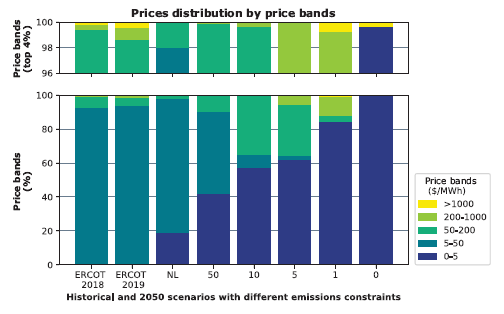 研究團隊的模型結(jié)果基于有效代表純粹能源電力市場結(jié)構(gòu),其中所有批發(fā)(以及零售)交易均以電力現(xiàn)貨市場價格進行。雖然不能直接比較,但研究團隊從德克薩斯州電力可靠性委員會(ERCOT)市場中參考了最新的(2019年)現(xiàn)貨價格,并總結(jié)了它們的分布。從圖6.22可以清楚地看出,隨著德克薩斯州的電力系統(tǒng)脫碳,批發(fā)能源價格分布發(fā)生相當(dāng)大的變化。與2019年相比,研究團隊的模型結(jié)果意味著更多的低價時段和更多的高價時段。但是可以注意到,研究團隊并未嘗試對德克薩斯州電力可靠性委員會(ERCOT)服務(wù)區(qū)域進行詳細的建模。其采用可能影響價格信號的市場干預(yù)和容量補償機制。此外,美國的其他獨立系統(tǒng)運營商(ISO)和區(qū)域輸電組織(RTO)或歐盟的電網(wǎng)運營商尚未采用純粹能源批發(fā)市場模式。美國大多數(shù)電力系統(tǒng)也有容量市場和相對較低的能源市場價格上限,這會將一些現(xiàn)貨價格變化(以及研究團隊目前討論的收入變化)轉(zhuǎn)變?yōu)槿萘績r格。然而,由于任何電力系統(tǒng)都必須滿足盈虧平衡的限制條件,因此從理論上說,每種技術(shù)的總收入應(yīng)該不受影響,盡管容量市場的增加可能會影響盈虧平衡的容量組合。