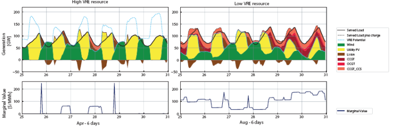 ?與鋰離子電池儲能系統(tǒng)相比,長時儲能系統(tǒng)的儲能容量成本更低,往返效率更低。當(dāng)碳捕獲和封存的天然氣發(fā)電并不是一種理想選擇時,長時儲能對電力系統(tǒng)脫碳的影響最大。在通常情況下,在優(yōu)化部署時,長時儲能系統(tǒng)可以替代天然氣發(fā)電設(shè)施,增加可變可再生能源發(fā)電的價值,并適度降低電力系統(tǒng)的電費。