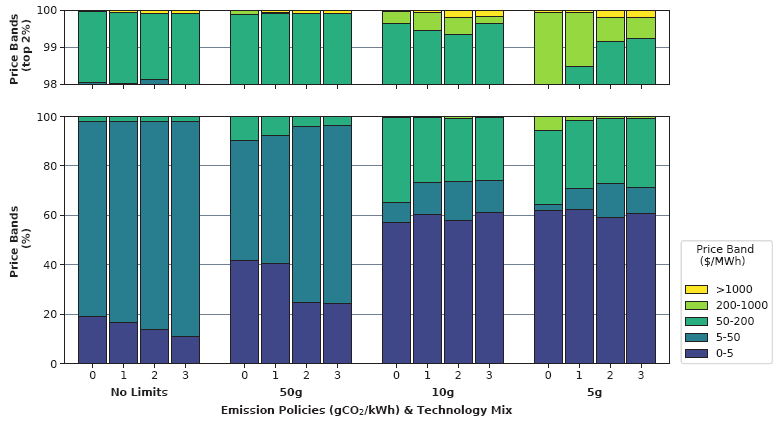 研究團隊的研究表明,隨著碳排放限制政策的收緊,持續(xù)時間的持續(xù)增加,其邊際值成本低于5美元/MWh,價格區(qū)間持續(xù)下降5~50美元/MWh。這些趨勢反映了可再生能源發(fā)電份額的增加和天然氣發(fā)電量的下降。圖6.22表明,在5gCO2/kWh的情況下,0~5美元/MWh的價格范圍包括高達62%的時間。如前所述,此處建模的0gCO2/kWh案例反映了對凈零碳電力系統(tǒng)的嚴(yán)格定義——僅依賴可再生能源和儲能系統(tǒng)并導(dǎo)致分布兩端的邊際價值大幅增加。而隨著碳排放限制收緊,這導(dǎo)致平均價格持續(xù)上漲。