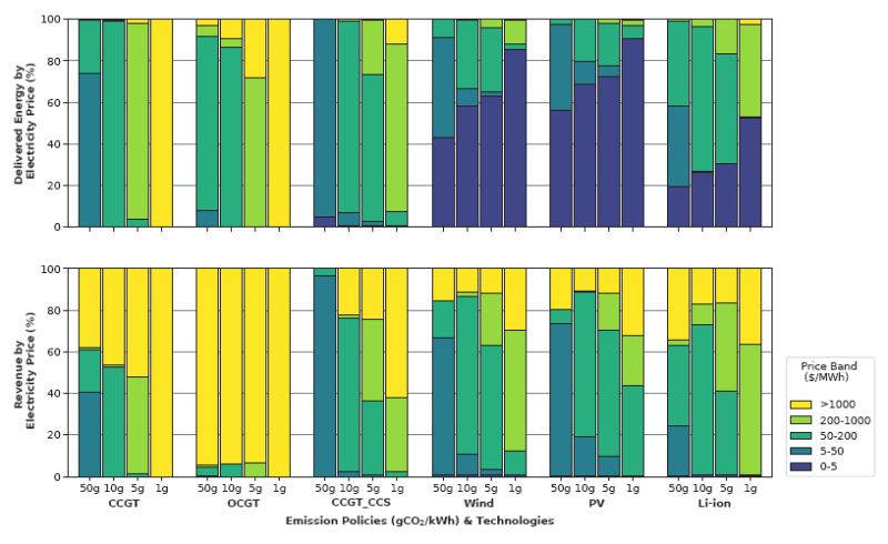 通過按價格區(qū)間分析系統(tǒng)運行和收入分配,研究團隊發(fā)現(xiàn)不同的技術(shù)在不同的價格區(qū)間運行并以不同的方式獲得收入,這取決于給定技術(shù)是邊際資源的可能性(圖6.25)。隨著碳排放限制更加嚴(yán)格,可再生能源發(fā)電設(shè)施的以更低的價格運行,并開始依靠更少的高價時間來賺取盈虧平衡所需的收入。例如,對于10gCO2/kWh克和5gCO2/kWh時情況下的風(fēng)力發(fā)電,其90%和96%的收入來自風(fēng)力發(fā)電價格高(高于50美元/MWh)期間提供的33%和35%的能源。研究團隊發(fā)現(xiàn)太陽能發(fā)電設(shè)施、鋰離子電池儲能系統(tǒng)和天然氣發(fā)電、碳捕獲和儲存(CCS))的結(jié)果相似,這意味著在能源批發(fā)電力市場下,這些資源需要在幾個小時內(nèi)獲得大部分收入設(shè)計。此外,優(yōu)化確保模型中的全部成本回收,因為模型假設(shè)負載和可再生能源可用性可以預(yù)見。實際上,很難為發(fā)電和儲能資產(chǎn)的投資提供資金,因為這些資產(chǎn)的大部分收入必須依賴于一年的少數(shù)運營時間。