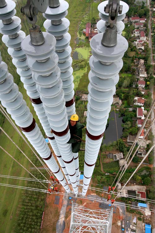 2011年12月5日,在安徽省青陽縣步嶺村,電力職工在90多米的高空對(duì)向家壩至上海±800千伏特高壓直流輸電線路安徽段的線路進(jìn)行檢修。新華社發(fā)(宋衛(wèi)星 攝)