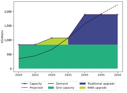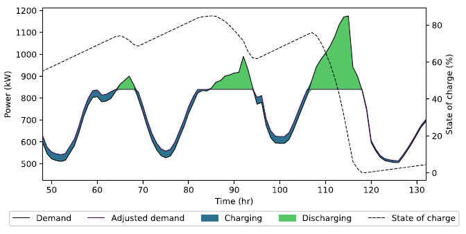 圖7.9 在夏季負(fù)荷情況下電池儲(chǔ)能系統(tǒng)作為非線纜替代方案 (NWA)的調(diào)度情況