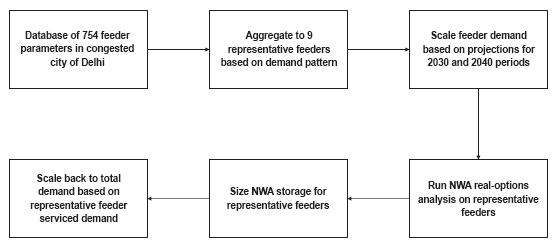 此外,研究團(tuán)隊(duì)根據(jù)各自的服務(wù)需求以及與德里這些支線可用的電力線路長度之比,估計(jì)了九個(gè)支線中的每一個(gè)在其他特大城市中所代表的線路長度。靈活的估值框架適用于每個(gè)特大城市的每個(gè)代表性支線,其方法是使用需求側(cè)模型中的適當(dāng)增長率來預(yù)測(cè)2030年和2040年的各種需求。電網(wǎng)投資成本是根據(jù)每個(gè)特大城市中每個(gè)代表性饋線的電力線路長度計(jì)算的。代表性饋線的最終分布式儲(chǔ)能系統(tǒng) (DLS)容量使用每個(gè)饋線的服務(wù)需求與代表需求的比率來衡量。