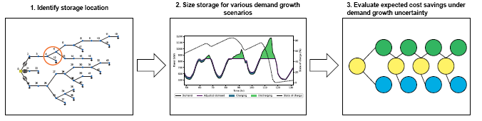 圖 7.6 總結(jié)了研究團(tuán)隊(duì)方法的三個(gè)步驟。首先,研究團(tuán)隊(duì)確定最佳的儲(chǔ)能部署地點(diǎn)以減輕配電網(wǎng)絡(luò)的過載。電網(wǎng)擁塞主要發(fā)生在電力需求峰值期間,因?yàn)殡娏π枨笠埠芨?,這意味著電網(wǎng)也在同時(shí)超載?;谠谧钌贁?shù)量的地理位置提供對(duì)電力線路的最大需求緩解來確定儲(chǔ)能部署的最佳位置。其次,研究團(tuán)隊(duì)根據(jù)負(fù)載曲線和網(wǎng)絡(luò)組件的過熱限制,針對(duì)給定的需求場景評(píng)估確定位置的電池儲(chǔ)能系統(tǒng)的成本進(jìn)行優(yōu)化。使用時(shí)間序列線性程序來調(diào)整儲(chǔ)能系統(tǒng)的規(guī)模以適應(yīng)各種需求增長情景。這些優(yōu)化確定要部署的電池儲(chǔ)能容量,從中研究團(tuán)隊(duì)推斷出分布式儲(chǔ)能系統(tǒng) (DLS)的資本和運(yùn)營成本。
