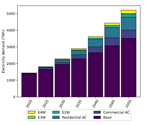 根據(jù)一項(xiàng)研究,需求增長而驅(qū)動(dòng)的能耗量可能導(dǎo)致印度2040年的能耗與2019年相比高出 81%,在這種情況下,電力需求增長更快,2040年與當(dāng)前相比將增長161%。雖然發(fā)達(dá)國家在未來十年的電力需求增長預(yù)測(cè)主要受交通運(yùn)輸電氣化驅(qū)動(dòng),但在印度和許多氣候炎熱的新興市場和發(fā)展中經(jīng)濟(jì)體 (EMDE)國家,預(yù)計(jì)建筑行業(yè)的發(fā)展將主導(dǎo)電力需求的增長,這主要是由于建筑將會(huì)安裝大量空調(diào)。與其他新的需求來源(如電動(dòng)汽車)相比,全天對(duì)空調(diào)制冷的較高且不靈活的需求,意味著建筑對(duì)電力需求的顯著增加。
