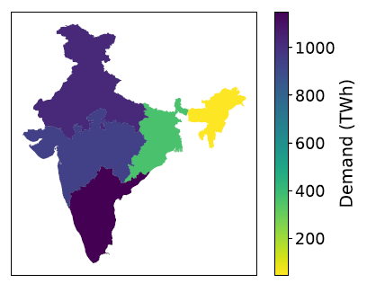 這些運(yùn)行限制是從基于2015年天氣模式的單年負(fù)荷數(shù)據(jù)中選擇的20多個(gè)具有代表性的電網(wǎng)運(yùn)行周建模,并通過聚類技術(shù)開發(fā)了可再生能源和水電資源配置文件。研究團(tuán)隊(duì)使用由電網(wǎng)運(yùn)營商(印度中央電力局2017年)定義的五個(gè)獨(dú)立的平衡區(qū)域(北部、西部、南部、東部和東北部)代表印度電網(wǎng),并根據(jù)上述情況為每個(gè)投資期開發(fā)特定區(qū)域的負(fù)載配置文件,這描述了需求預(yù)測(cè)模型。這些區(qū)域之間的電力流動(dòng)基于簡化的網(wǎng)絡(luò)表示進(jìn)行建模,該電網(wǎng)表示強(qiáng)制執(zhí)行區(qū)域之間的電力交換限制。對(duì)于2020年,這些功率限制來自系統(tǒng)運(yùn)營商;而在未來,這些限制可能會(huì)隨著額外的輸電投資而擴(kuò)大。