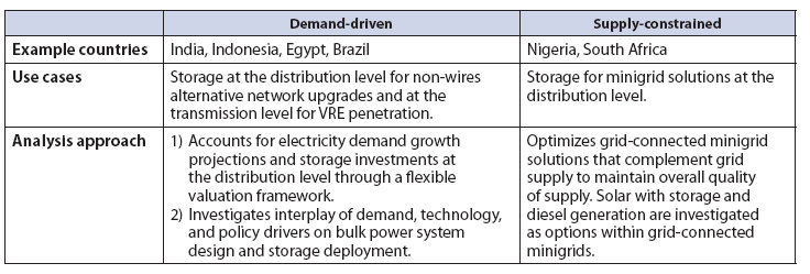 研究團(tuán)隊(duì)的分析考慮了兩類新興市場和發(fā)展中經(jīng)濟(jì)體(EMDE)國家背景下的儲(chǔ)能部署(表7.1):(1)需求驅(qū)動(dòng)型國家(例如印度),其中了解未來電力使用的需求增長和模式對(duì)于了解儲(chǔ)能部署用例至關(guān)重要;(2)電力供應(yīng)受限的國家(例如尼日利亞),在這些國家,滿足需求的電網(wǎng)可用性持續(xù)時(shí)間和時(shí)間的不確定性是儲(chǔ)能部署的關(guān)鍵驅(qū)動(dòng)因素。為了分析需求驅(qū)動(dòng)的新興市場和發(fā)展中經(jīng)濟(jì)體(EMDE)中的儲(chǔ)能部署用例,研究團(tuán)隊(duì)進(jìn)行了需求側(cè)建模,以探索儲(chǔ)能系統(tǒng)的使用如何影響印度市場背景下電力需求狀況的長期演變。然后,研究團(tuán)隊(duì)利用其需求側(cè)的調(diào)查結(jié)果,在一系列技術(shù)和政策情景中探索印度配電和輸電系統(tǒng)(分別為第7.2.2和7.2.3節(jié))中儲(chǔ)能系統(tǒng)帶來的價(jià)值。在印度背景下的分析結(jié)果可以廣泛推廣到表現(xiàn)出類似情況的其他國家和地區(qū),特別是東南亞。相比之下,為了評(píng)估儲(chǔ)能系統(tǒng)在供應(yīng)受限地區(qū)的作用,研究團(tuán)隊(duì)調(diào)查了尼日利亞消費(fèi)者住宅太陽能發(fā)電設(shè)施配套部署的儲(chǔ)能系統(tǒng)的一部分價(jià)值主張。