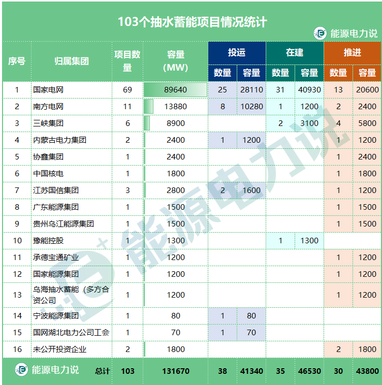 能源電力說統(tǒng)計了截止目前103個抽水蓄能項目,包含投運38個、在建35個、推進中30個;103個項目總投資超6000億元,容量規(guī)模超130GW(1.3億千瓦),其中在建項目投資額超2900億元,容量規(guī)模超46GW;推進中項目投資額超2000億元,容量規(guī)模超43GW。