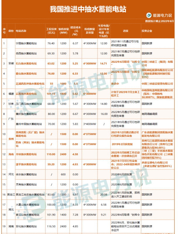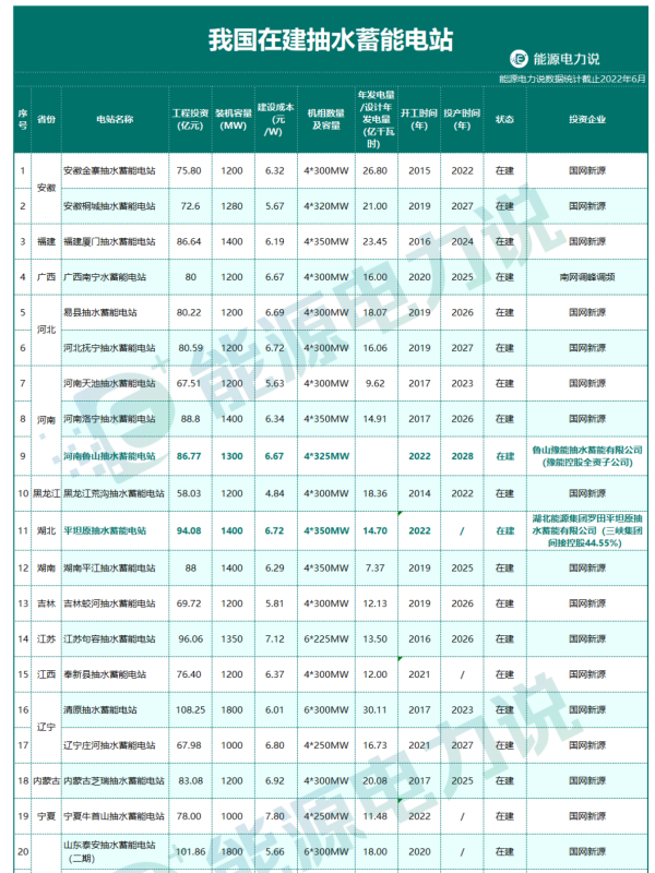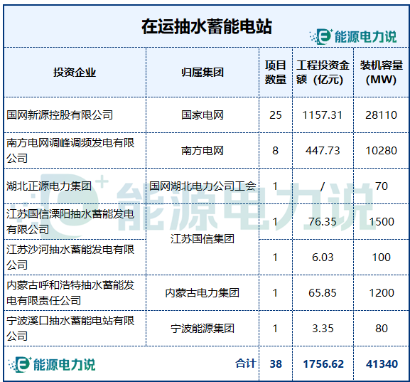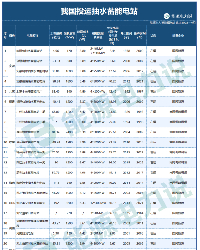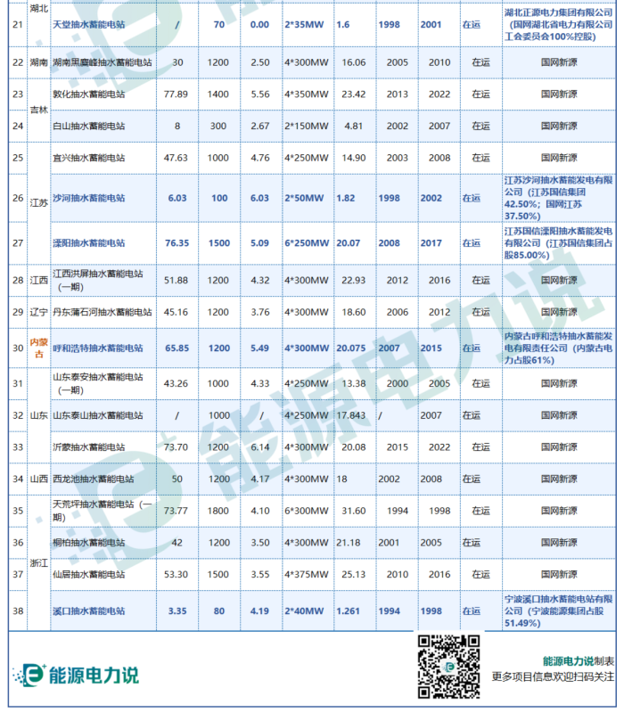38個投運抽水蓄能電站名單如下 :