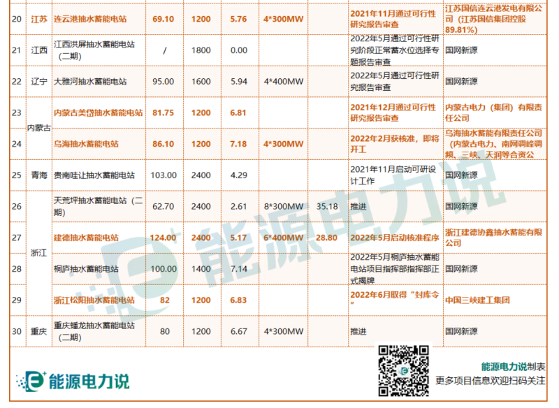 30個推進中抽水蓄能電站名單如下 :