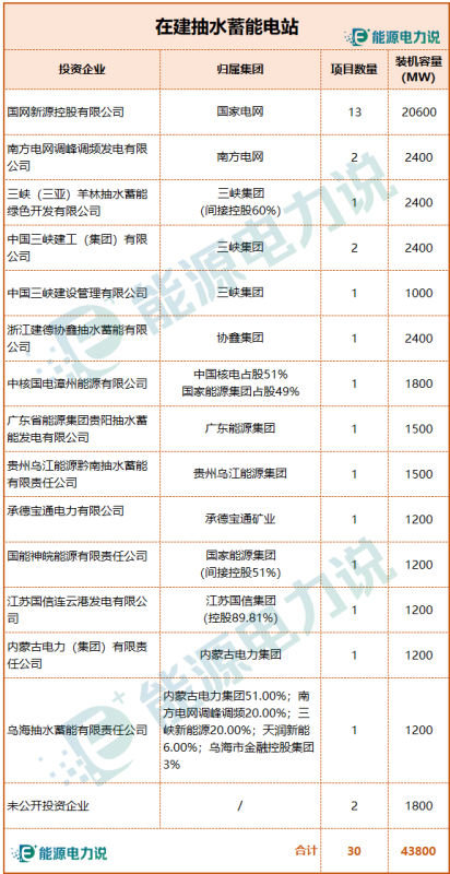 投資企業(yè)方面除國家電網(wǎng)旗下國網(wǎng)新源、南方電網(wǎng)旗下南網(wǎng)調(diào)峰調(diào)頻公司兩大主力外,還有內(nèi)蒙古電力、三峽集團、國家能源集團、中國核電、豫能控股、江蘇國信集團、廣東能源集團、寧波能源集團、承德寶通、協(xié)鑫、天潤新能等。
