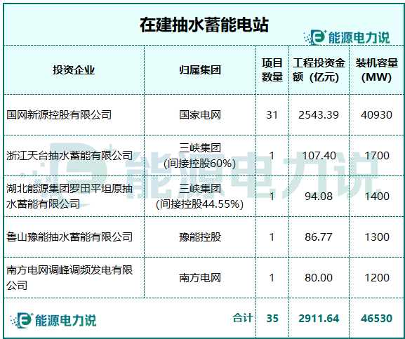 能源電力說統(tǒng)計了截止目前35個在建抽水蓄能項目,設計投資金額超2900億元,總?cè)萘恳?guī)模達到46.5GW。