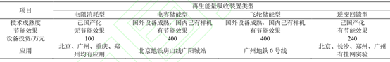 地鐵能量回收是一種大功率、高頻次的應(yīng)用場景,目前應(yīng)用較為廣泛的是再生制動能量吸收利用。當(dāng)制動能量不能被本車吸收時(shí),牽引網(wǎng)電壓上升,上升到一定程度后,牽引變電所中再生制動能量吸收裝置投入工作,吸收再生電流,使車輛再生電流穩(wěn)定。目前,再生能量吸收裝置可分為電阻消耗型、電容儲能型、飛輪儲能型、逆變回饋型,各類型裝置對比如表所示。目前電容儲能型和飛輪儲能型較為常用。