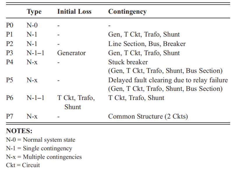 輸電網(wǎng)規(guī)劃必須符合最低的性能標準,例如北美的 NERC TPL-001-4。性能要求確保在規(guī)劃范圍內,大容量電力系統(tǒng) (BES) 將在廣泛的系統(tǒng)條件下可靠運行,并遵循表 1.1 中總結的各種可能的突發(fā)事件。根據(jù) NERC TPL-001-4 標準的應急分類可以總結如下:P0 是完整系統(tǒng)(N-0);P1為單一元件失效(電路、發(fā)電機、變壓器、分流裝置);P2也是單一元件失效(線路分段、母線、斷路器);P3是發(fā)電機失效一段時間后第二個元件失效(N-1-1),P4是多元件失效(斷路器拒動),P5也是多元件失效(繼電保護故障清除延遲)失效); P6 是單個元件(線路、變壓器、分流裝置)失效后的另一個單個元件(N-1-1)失效,P7 是多個元件(一般結構)的失效。