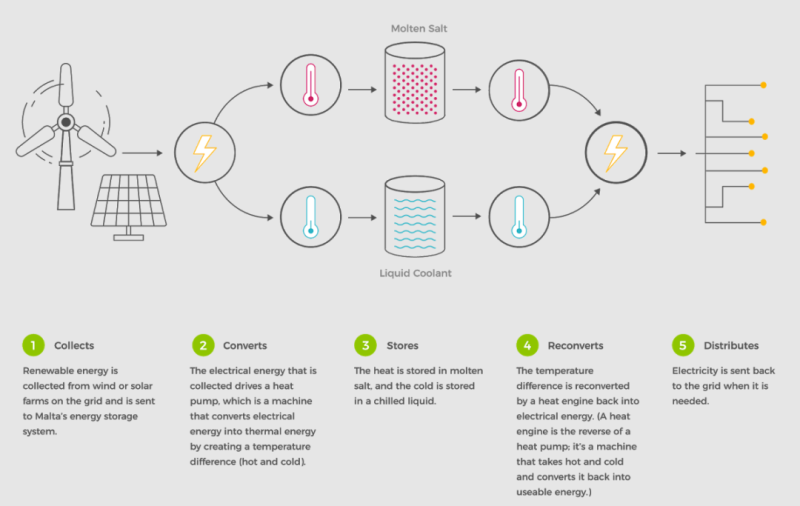 和國內(nèi)主流的熔鹽儲能技術(shù)不同的是,Malta在系統(tǒng)中采用了高溫?zé)岜?。如上圖所示,可再生能源的廉價(jià)電能進(jìn)入儲能系統(tǒng),通過一種高溫?zé)岜脤㈦娔苻D(zhuǎn)化為冷能和熱能兩種形式,熱能存儲于熔鹽中,冷能存儲于一種冷凍液中,在需要之時,冷熱能可通過一種熱機(jī)再次轉(zhuǎn)化為電能,返回電網(wǎng),也可將熱能和冷能直接供應(yīng)給能源用戶。