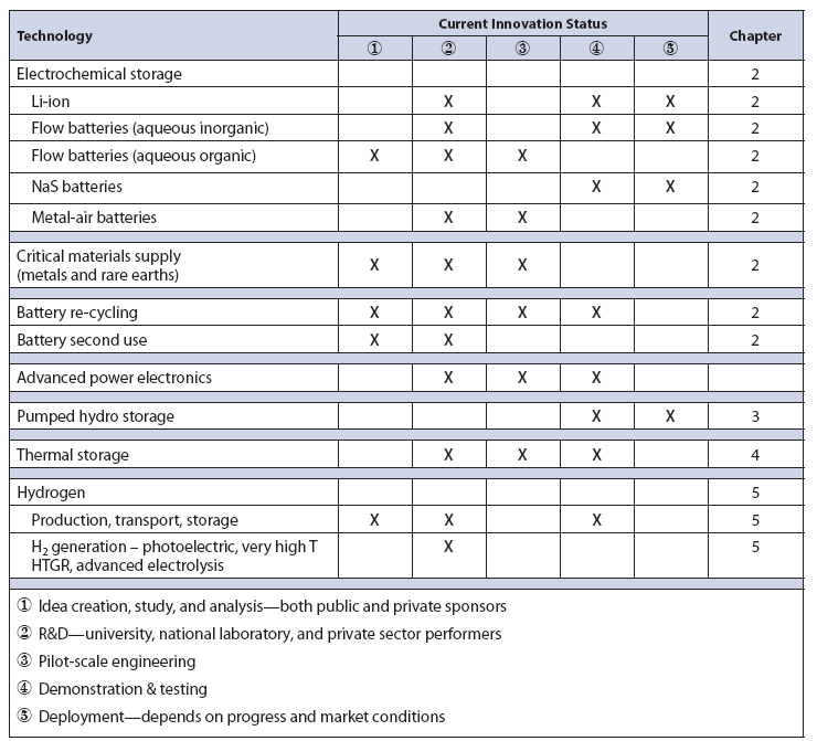 表9.1 麻省理工學(xué)院能源倡議(MITEI)關(guān)于選定當(dāng)前創(chuàng)新狀態(tài)的未來儲能研究結(jié)果總結(jié)