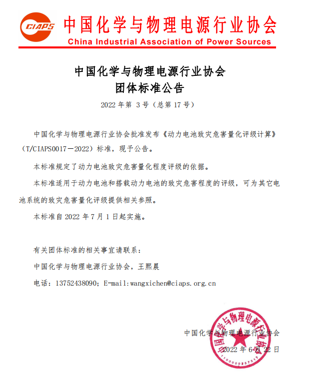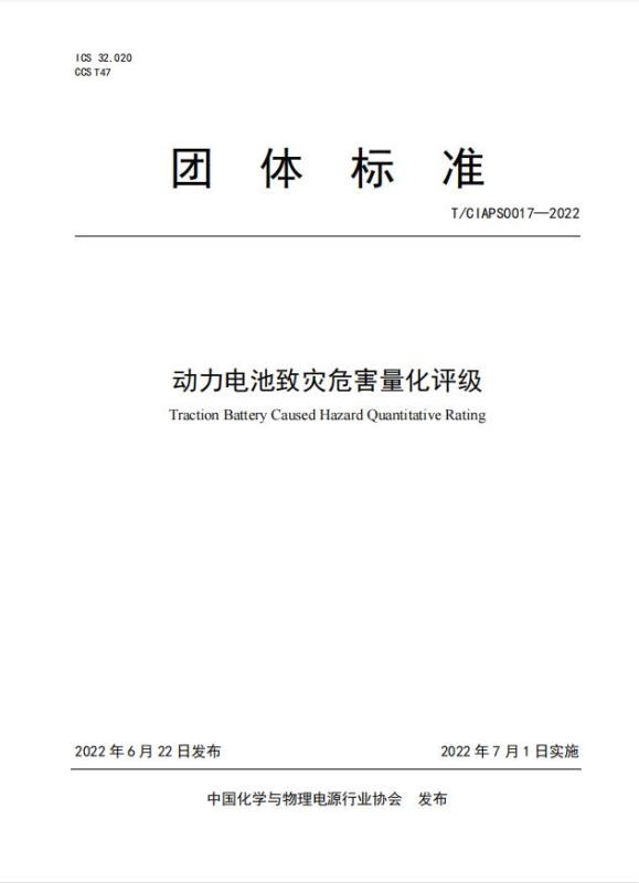 中國(guó)化學(xué)與物理電源行業(yè)協(xié)會(huì)批準(zhǔn)發(fā)布《動(dòng)力電池致災(zāi)危害量化評(píng)級(jí)計(jì)算》(T/CIAPS0017―2022)標(biāo)準(zhǔn),現(xiàn)予公告。