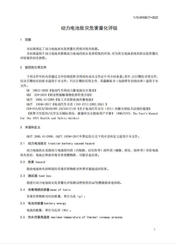 本標(biāo)準(zhǔn)適用于動(dòng)力電池和搭載動(dòng)力電池的致災(zāi)危害程度的評(píng)級(jí),可為其它電池系統(tǒng)的致災(zāi)危害量化評(píng)級(jí)提供相關(guān)參照。