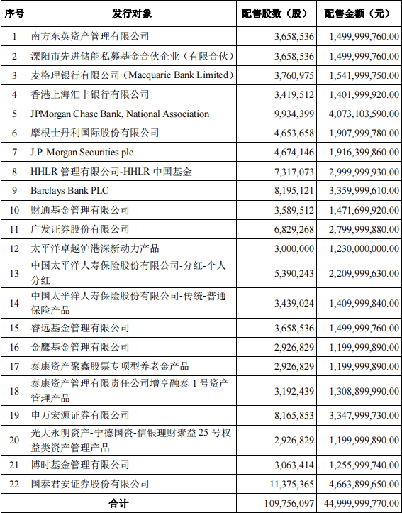 6月22日晚,寧德時(shí)代(SZ300750,股價(jià)507.00元,市值1.18萬億元)發(fā)布公告稱,本次定增的發(fā)行價(jià)格最終為410元/股,共募集資金總額約為450億元,扣除各項(xiàng)發(fā)行費(fèi)用(不含增值稅)后,實(shí)際募集資金凈額人民幣448.7億元。共有22家投資者獲配。其中,國泰君安、J.P.Morgan Chase Bank、Barclays Bank Plc分別以46.6億元、40.7億元和33.6億元排在本次配售金額的前三位。