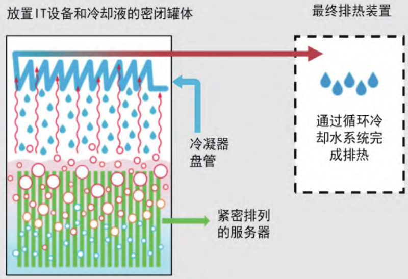 在雙相浸沒式液冷中,冷卻液在循環(huán)散熱過程中不斷經(jīng)歷從液態(tài)到氣態(tài)再從氣態(tài)回到液態(tài)的相變過程。IT設(shè)備完全浸沒在裝有低沸點(diǎn)冷卻液的密閉罐體中,設(shè)備發(fā)出的熱量被冷卻液吸收,冷卻液吸熱后溫度升高,達(dá)到沸點(diǎn)后開始沸騰,由液態(tài)相變?yōu)闅鈶B(tài),同時(shí)產(chǎn)生大量的蒸汽。蒸汽從液體中升起逃逸至液面上方,在液冷罐體內(nèi)形成氣相區(qū)。氣相區(qū)的冷卻液蒸汽與水冷冷凝器接觸,熱量被冷凝器吸收,冷卻液凝結(jié)成液體以液滴的形式落回容器中再次循環(huán),而冷凝器中被加熱的冷卻水則通過循環(huán)冷卻水系統(tǒng)完成排熱。