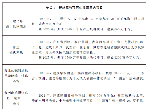 (1)加快風光“四基地、兩示范”建設。堅持海陸并進、集散并舉,大力發(fā)展風電、光伏發(fā)電。到2025年,光伏發(fā)電、風電裝機分別達到6500萬千瓦、2800萬千瓦;到2030年,分別達到1.25億千瓦、5500萬千瓦。海上風電基地。打造山東半島海上風電基地,聚焦渤中、半島南、半島北三大片區(qū),以省管海域為重點,加快啟動首批千萬千瓦海上風電項目建設,逐步推動海上風電向深遠海發(fā)展。探索推進海上風電軍民融合發(fā)展新模式。2022年,海上風電開工500萬千瓦,建成200萬千瓦左右。到2025年,開工1200萬千瓦,建成800萬千瓦;到2030年,建成3500萬千瓦。海上光伏基地。按照“由近及遠、由易到難、示范先行、分步實施”思路,以濱州、東營、濰坊、煙臺等市近海海域為重點,采用漁光互補、多能互補等模式,推動樁基固定式海上光伏項目開發(fā)建設。結合海上風電開發(fā)布局,在具備條件的海域開展漂浮式海上光伏示范,打造“風光同場”海上清潔能源基地。2022年,海上光伏開工300萬千瓦,建成150萬千瓦左右,啟動漂浮式海上光伏示范工作。到2025年,開工1500萬千瓦,建成1200萬千瓦左右;到2030年,建成4000萬千瓦左右。魯北鹽堿灘涂地風光儲輸一體化基地。充分利用濰坊、濱州、東營等市的鹽堿灘涂地和菏澤等市的黃河灘涂地,推進風電、光伏、儲能等一體化設計、建設和運營。到2025年,建成1000萬千瓦以上;到2030年,總開發(fā)規(guī)模達到2500萬千瓦。魯西南采煤沉陷區(qū)“光伏+”基地。以濟寧、泰安、棗莊、菏澤等市采煤沉陷區(qū)為重點,采用漁光互補、農光互補、生態(tài)治理等融合發(fā)展模式,推進光伏發(fā)電基地建設。到2025年,基地光伏發(fā)電裝機達到300萬千瓦;到2030年,達到500萬千瓦。整縣分布式光伏規(guī)?;_發(fā)示范。全面啟動沂水、諸城、嘉祥等70個國家試點縣建設工作,推動黨政機關、公共建筑、工商業(yè)廠房和農村居民屋頂等分布式光伏開發(fā)建設。到2025年,50%以上試點縣達到國家標準,開發(fā)規(guī)模達到2000萬千瓦以上;到2030年,試點縣全部達到國家標準,總開發(fā)規(guī)模達到3000萬千瓦以上。“百鄉(xiāng)千村”綠色能源發(fā)展示范。統(tǒng)籌推進鄉(xiāng)村太陽能、生物質能、地熱能等可再生能源多元化綜合開發(fā)利用,打造農村地區(qū)用電、取暖、炊事等一體化清潔用能新模式。到2025年,建成100個左右“標桿鄉(xiāng)鎮(zhèn)”和1000個左右“標桿村”;“十五五”期間,鄉(xiāng)村綠色能源發(fā)展模式得到全面推廣。(牽頭部門:省能源局,配合部門:省發(fā)展改革委、省住房城鄉(xiāng)建設廳、省水利廳、省農業(yè)農村廳、省海洋局)