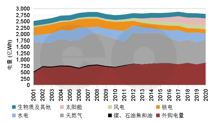 碳達(dá)峰前后,用電量較為平穩(wěn),歷史峰值年是2008年。加州電力系統(tǒng)運(yùn)營(yíng)商CAISO管理著該州80%左右的電力,根據(jù)CAISO披露的數(shù)據(jù),加州近20年來用電量年均僅增長(zhǎng)0.5%。用電量的歷史峰值出現(xiàn)在2008年(見圖5),負(fù)荷峰值年為2007年。