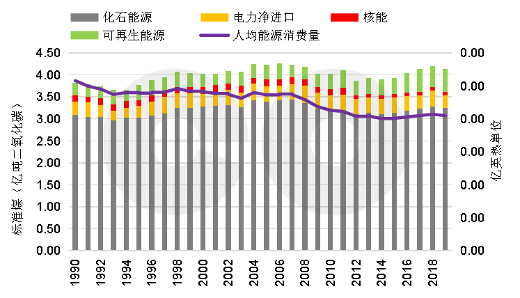 能源消費(fèi)量的歷史峰值年為2006年,30多年來消費(fèi)量在峰值附近小幅波動(dòng)。2006年后,能源消費(fèi)量經(jīng)歷了先下降后又小幅上升過程,目前為峰值的95%,與1998年相當(dāng)(見圖4)。長(zhǎng)遠(yuǎn)看,由于可再生能源利用規(guī)模不斷擴(kuò)大,而化石能源被替代仍有一段較長(zhǎng)的過程,能源消費(fèi)仍存在繼續(xù)增長(zhǎng)的可能。